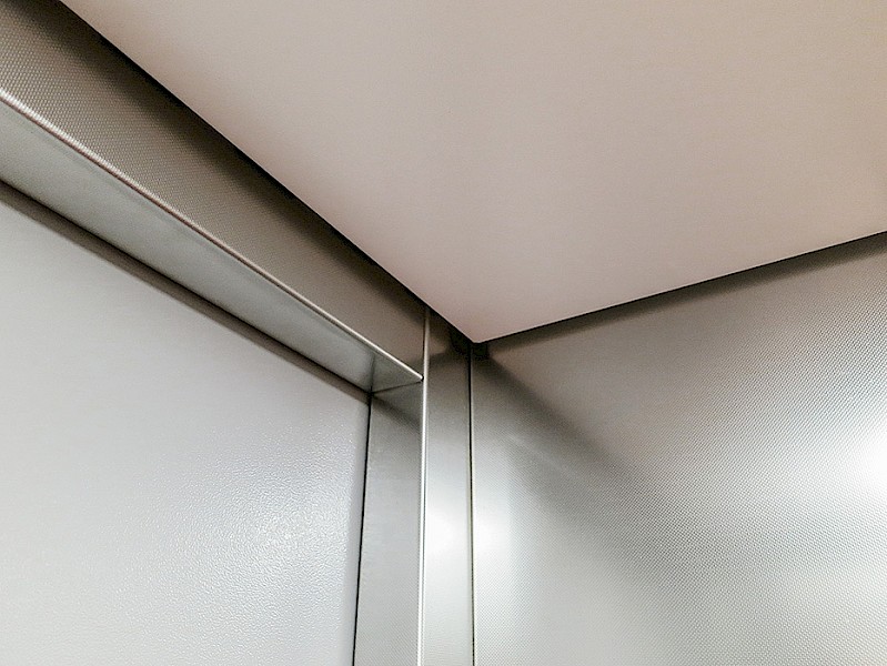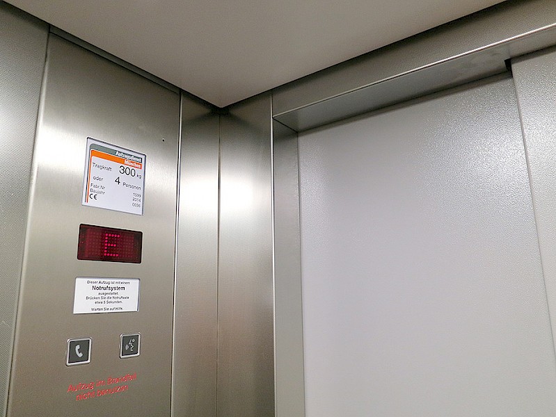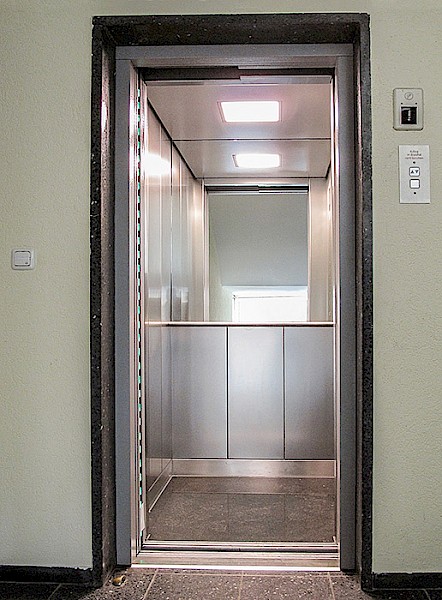 - Erneuerung der Aufzugskabine mit Wänden aus pflegeleichtem, geprägtem Edelstahl und hochwertigem Steinboden