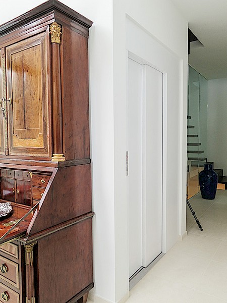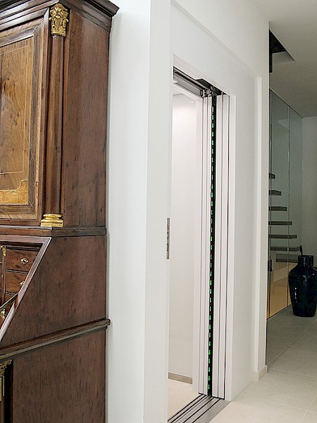 Mit den weißen colorierten Glaswänden wurde das Aufzugsdesign unauffällig dem Stil der Villa angepasst; die Türen verfügen über eine feinstrukturierte Pulverlackierung.