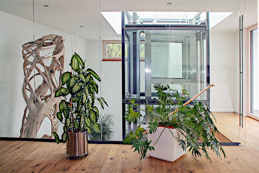 Lichtdurchfluteter Glasaufzug in einer Neubau-Villa in München-Schwabing