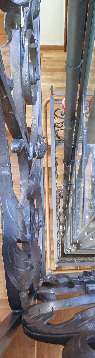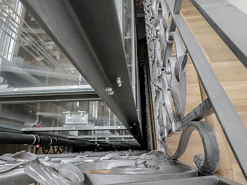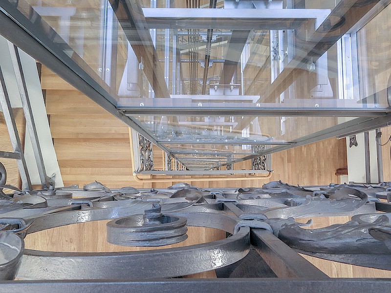 Aus architektonischer Sicht war der Verzicht auf einen separaten Maschinenraum ein wichtiges Argument. Wegen der prognostizierten starken Frequentierung der Aufzugsanlage wurde eine Seilanlage ausgewählt. Die verbaute Schraubkonstruktion des Schachtgerüstes sorgt in Kombination mit dem aufwendig restaurierten Treppengeländer für große Begeisterung.