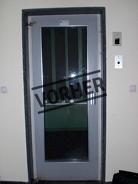 - Austausch der alten Drehtüren gegen benutzerfreundliche Schiebetüren mit kratzfester Pulverbeschichtung, im Farbton passend zum Treppenhaus