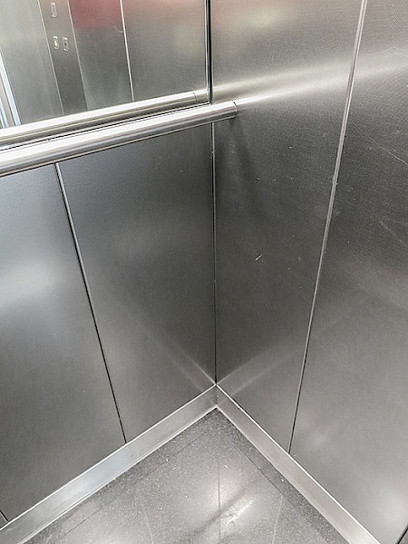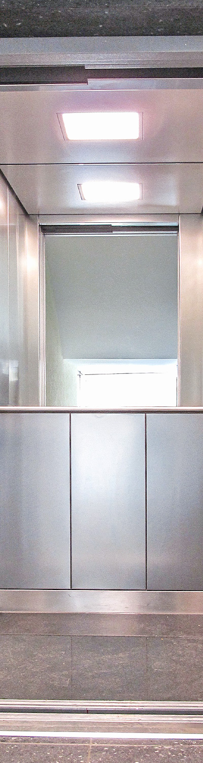 - Erneuerung der Aufzugskabine mit Wänden aus pflegeleichtem, geprägtem Edelstahl und hochwertigem Steinboden