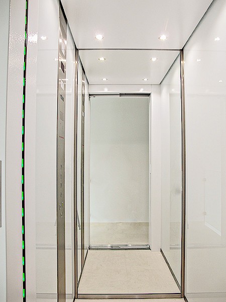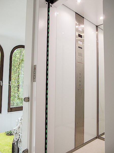 Mit den weißen colorierten Glaswänden wurde das Aufzugsdesign unauffällig dem Stil der Villa angepasst; die Türen verfügen über eine feinstrukturierte Pulverlackierung.