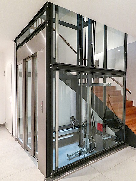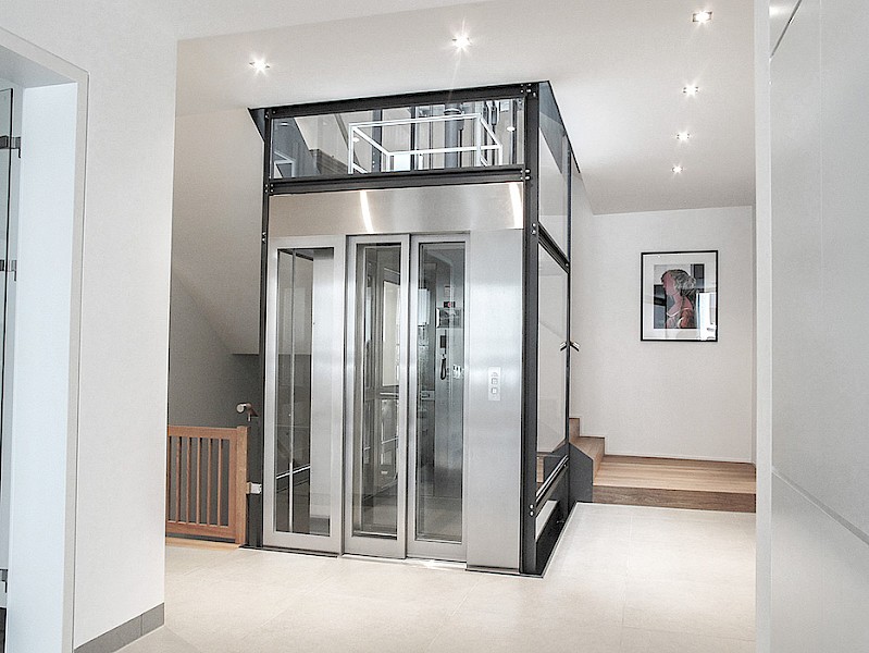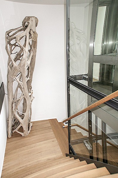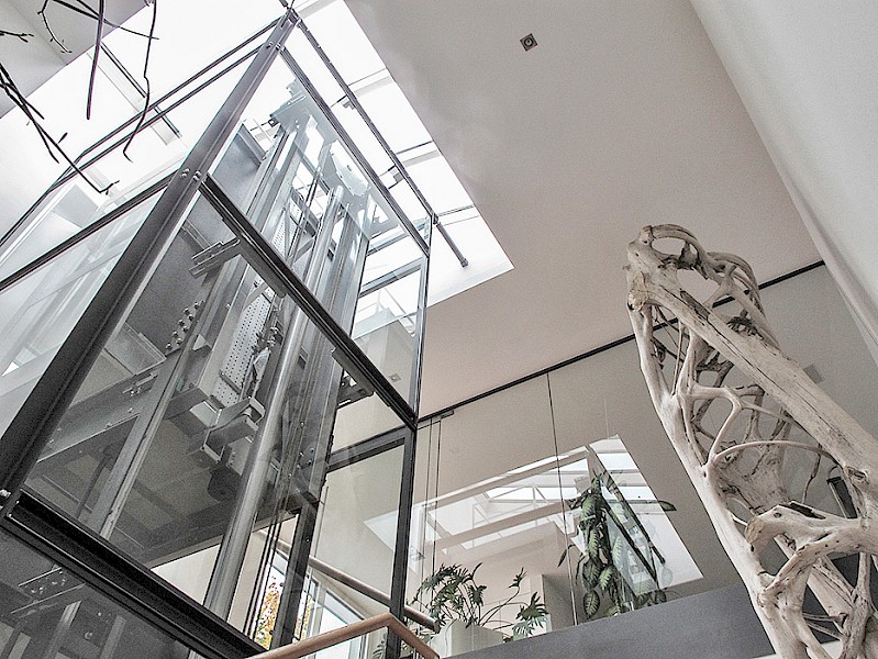 Vorgesehen war ein Aufzug mit Glasschachtgerüst, vier Haltestellen und einer Tragfähigkeit von 450 kg (6 Personen). Um dem lichtdurchfluteten Treppenauge viel Transparenz zu geben, wurden große Glasflächen eingesetzt. Die edelstahlgerahmten Türen betonen den edlen Charakter der Aufzugsanlage. Zum Einsatz kam das zuverlässige seilhydraulische Aufzugssystem.