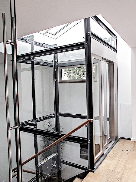 Lichtdurchfluteter Glasaufzug in einer Neubau-Villa in München-Schwabing