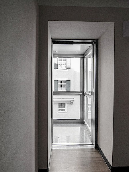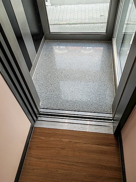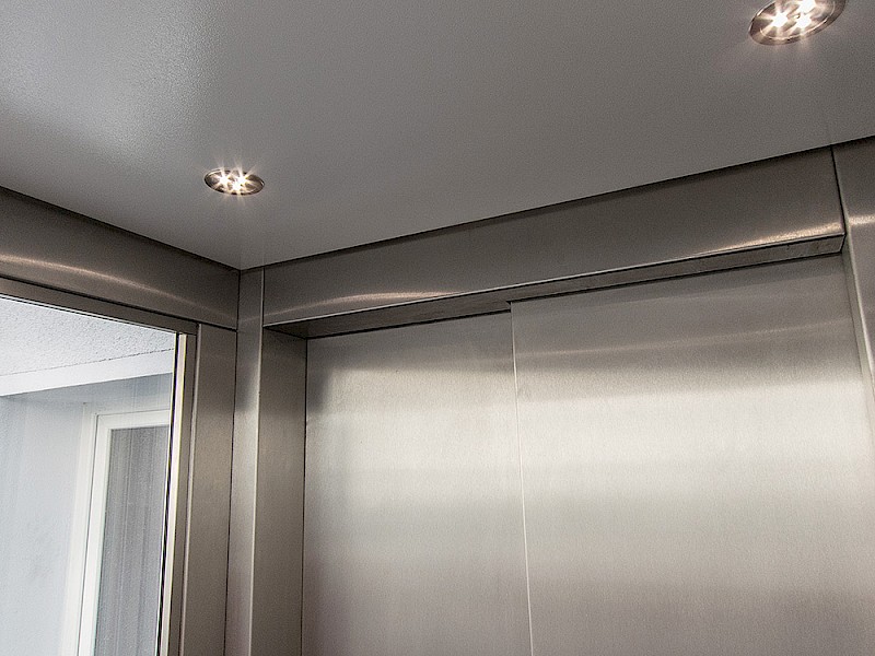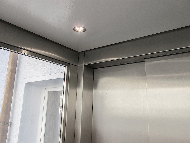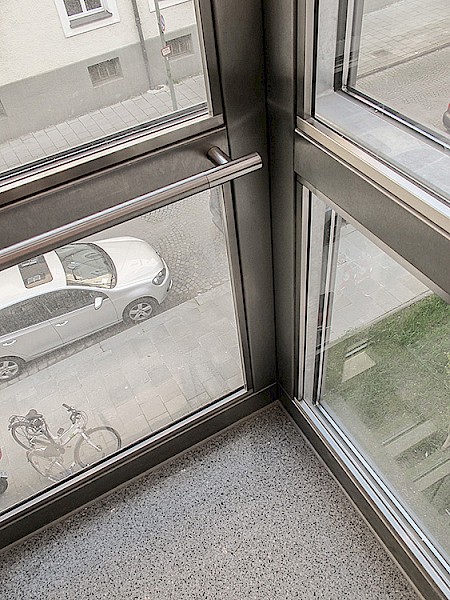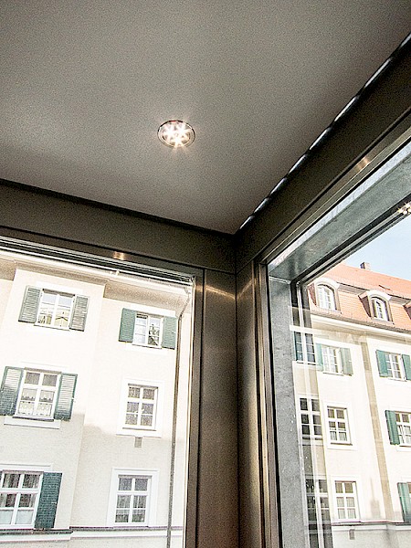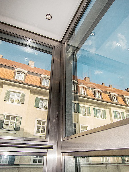 Hierbei wurde ein Schachtgerüst mit Isolierverglasung und formschönen Vorsatzprofilen verbaut. Die Panorama-Aufzugskabine lässt einen freien Blick nach außen zu. Der seilhydraulische Aufzug mit Systemschrank benötigt keinen zusätzlichen Maschinenraum.