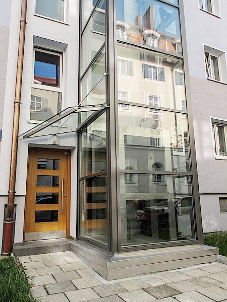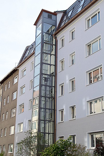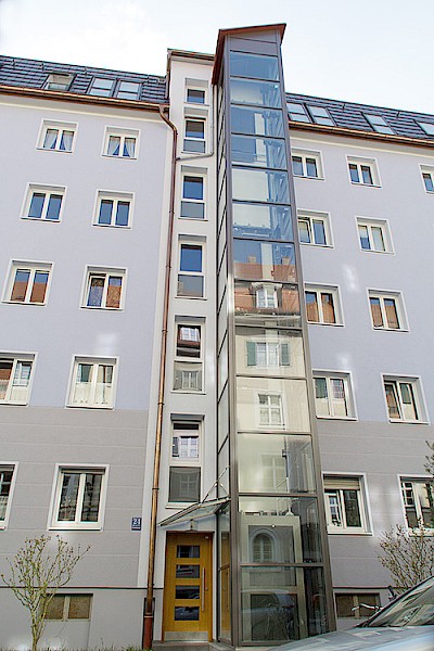 Im Zuge des Dachausbaus an einem bestehenden Gebäude wurde der Anbau eines Glasaufzuges an die Hausfassade vorgenommen.