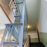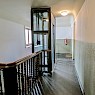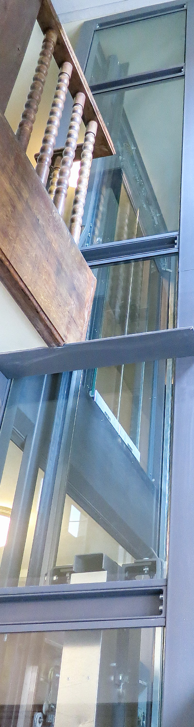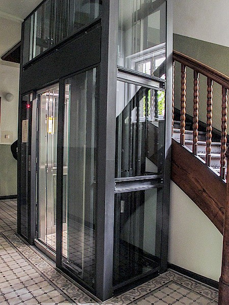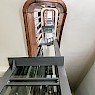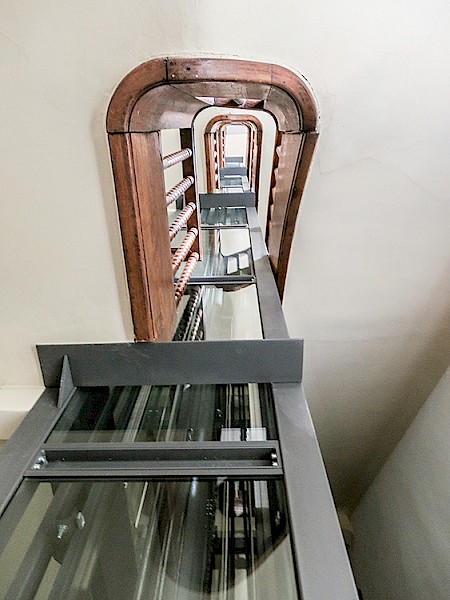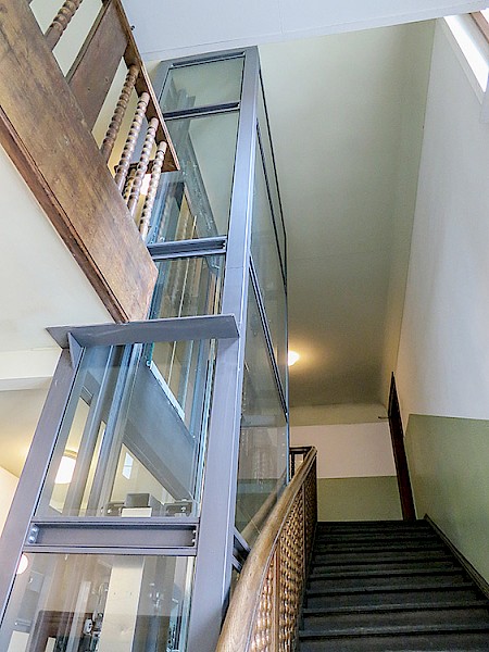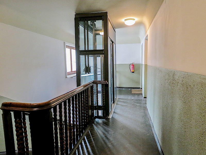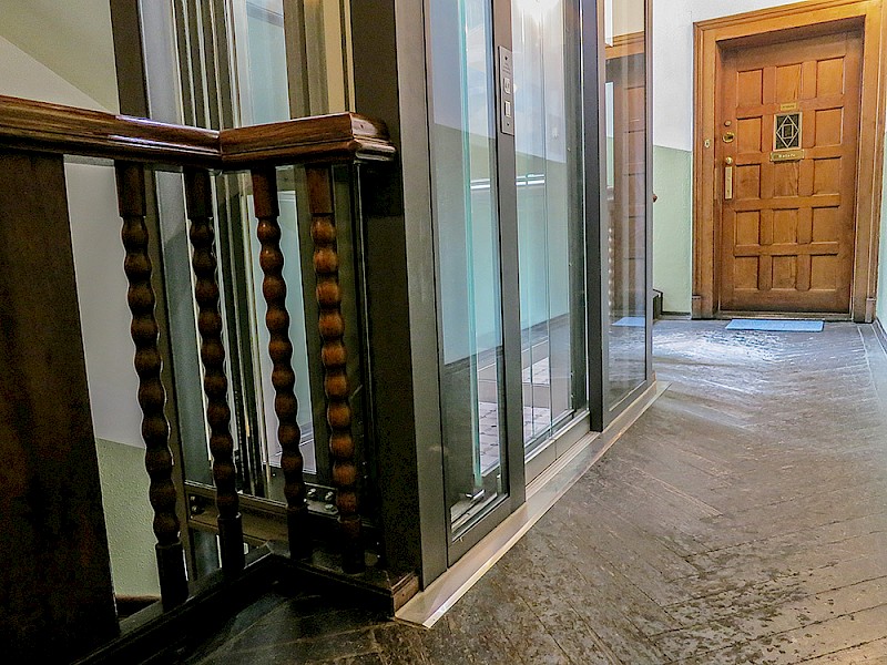 Erst durch das Ausschneiden der Podeste war der Einbau eines ausreichend großen Aufzugs möglich. Der Aufzug mit 225 kg Tragkraft (3 Personen) befördert die Bewohner nun über 6 Etagen.