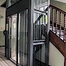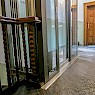 Seilhydraulische Aufzugsanlage im Glasschacht im sehr schmalen Treppenauge.