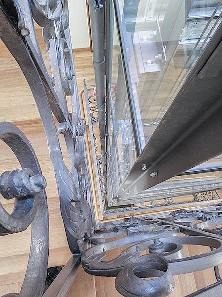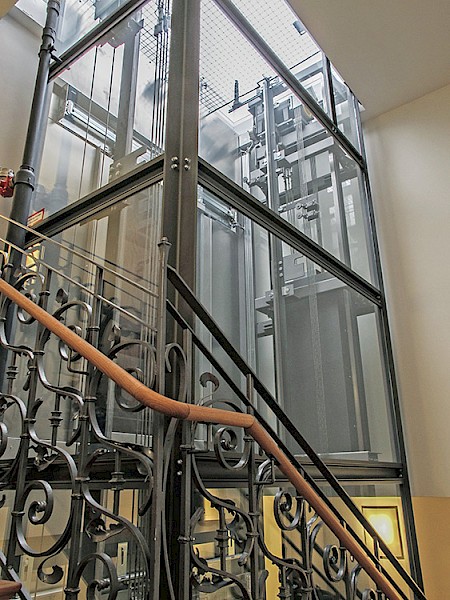 Aus architektonischer Sicht war der Verzicht auf einen separaten Maschinenraum ein wichtiges Argument. Wegen der prognostizierten starken Frequentierung der Aufzugsanlage wurde eine Seilanlage ausgewählt. Die verbaute Schraubkonstruktion des Schachtgerüstes sorgt in Kombination mit dem aufwendig restaurierten Treppengeländer für große Begeisterung.